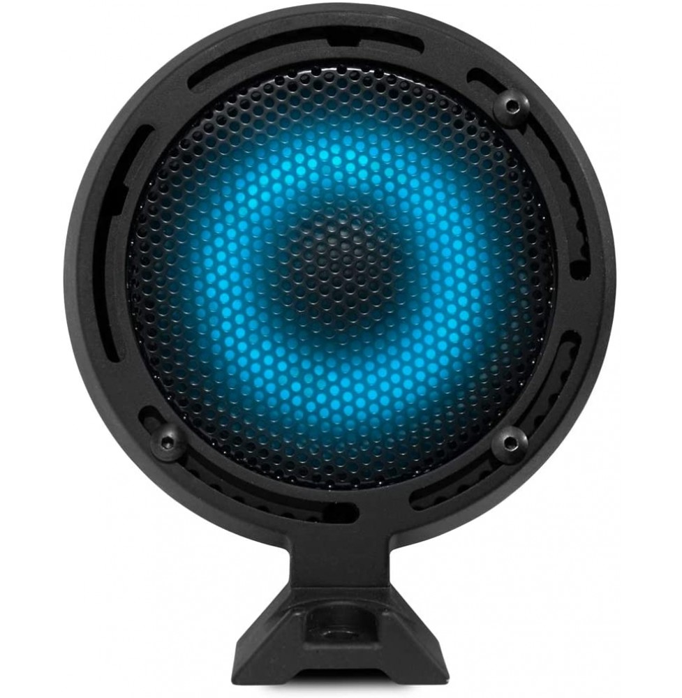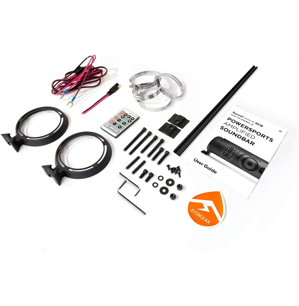 100% Waterproof (IP66) - shock resistant, sand proof and dust proof!Multi-Color LED Backlit Speakers - green, red, white, blue; music sync, solid, fading or offRear Facing 160 Lumens LED Light Bar - white (high, medium, low), red, yellow or off300 Watts - peak output with optimized bass performance provides deep bass and clear vocalsMarine Grade 5 Speaker System - 1 tweeter, 2 midrange, and 2 woofersBluetooth 5.0 - streams your music from your phone up to 100 feet away; or connect to the integrated wired AUX-IN jackIntegrated Controls - volume, play/pause, forward/back, backlit speaker and light bar modeFast Charge - any device via the 2.1A USB port12V Power Outlet - to connect accessory light bars or speakersECOCAST - Connect up to 50 ECOXGEAR speakers with the ECOCAST feature (not compatible with ECOCONNECT generation speakers)ECOTALK - for direct connect to Siri or OK Google and built-in speakerphoneEasy to Install - multiple mounting options with the included 8-foot wiring harness, mounting brackets and related hardwareWhat is in the Box - SoundExtreme SE18, user guide, 12V DC power supply cable, auxiliary power out mating connector, 2x mounting brackets and related hardware, and long range RF remote control; 1 year warranty on parts and labor